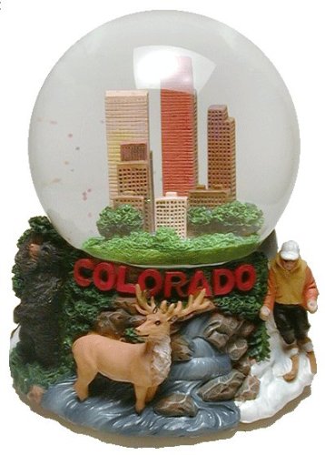 Bustling Denver's skyline inside the globe exists in perfect snowglobe harmony with Mesa Verde cliff dwellings, Aspen and Telluride skiing and mountain wildlife. Music box plays Rocky Mountain High. Cast resin base/glass globe. 5-1/2 inches (14 cm) tall.