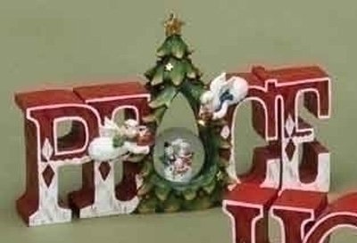 Inspirational word table top decoration features a darling snowman couple and Christmas tree accents Reads "PEACE"